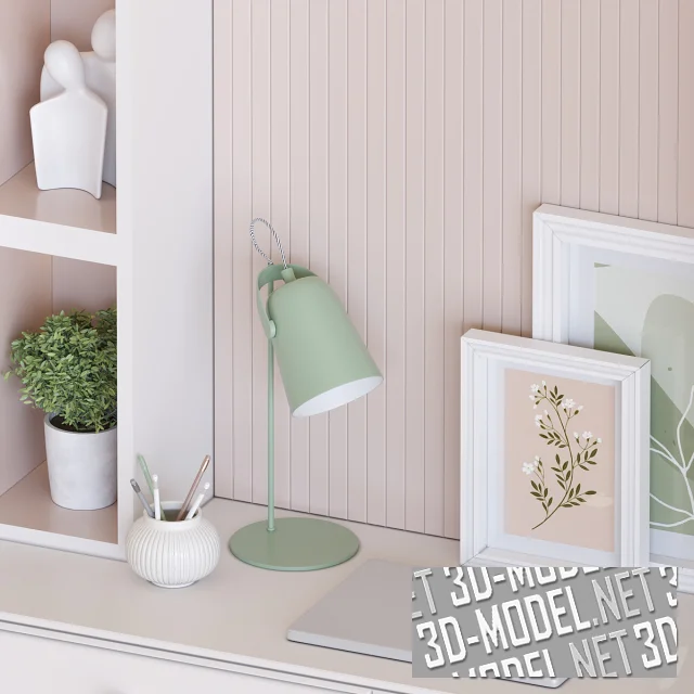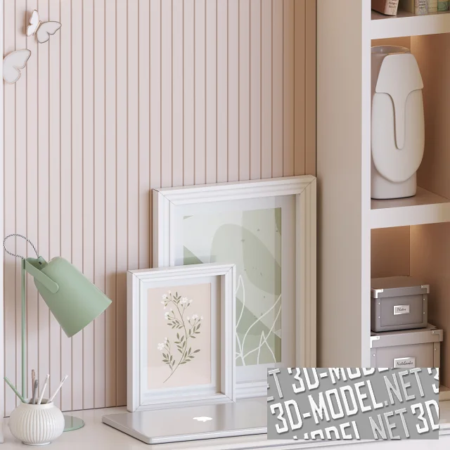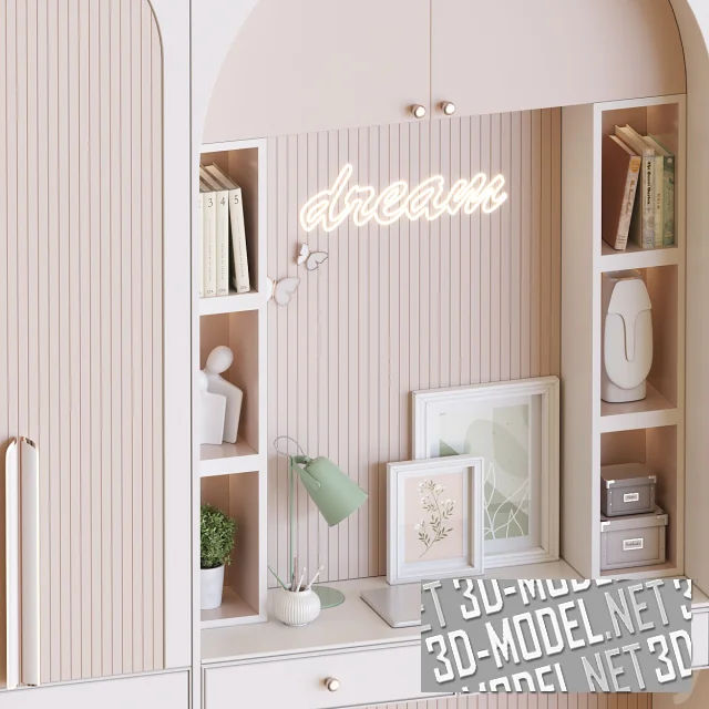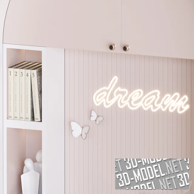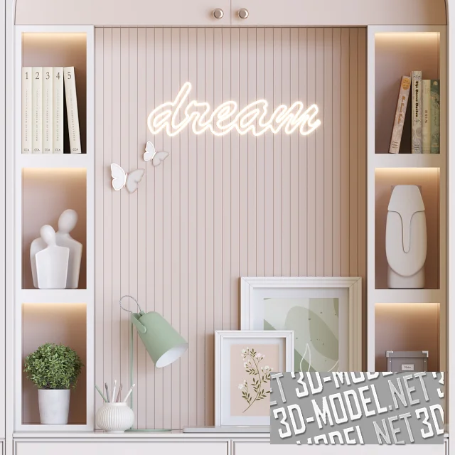 На столе белые фоторамки, белая вазочка с карандашами, ноутбук, настольный светильник светлого, бледно-зеленого цвета. Над столом смонтирована светящаяся надпись «dream» и пара декоративных бабочек. На полках пеналов расположены книги, белый горшок с шаровидным зеленым растением, декоративные коробки, статуэтки.