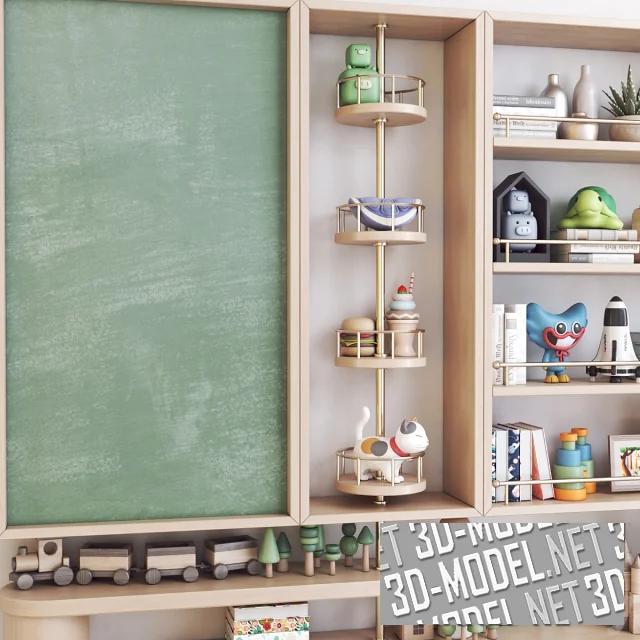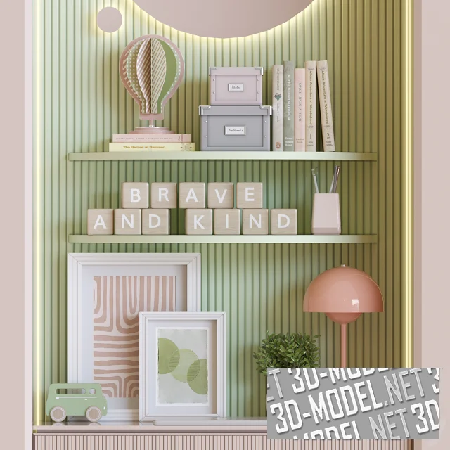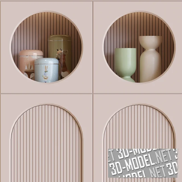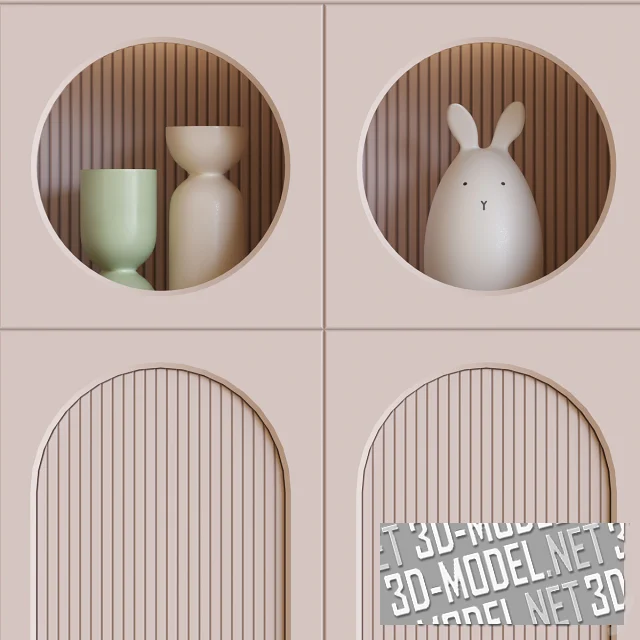 Современная мебельная группа в пастельных (нюдово-салатовых) тонах для детской комнаты, с аксессуарами и декором. Габарит блока: 300х45х28см. В левой части оборудован трехстворчатый платяной шкаф. Створки декорированы фрезерованными арками. В фасадах антресолей вырезаны круги, за которыми размещены секции с полкой и скрытой подсветкой. Задняя стенка этих секций декорирована вертикальными канавками. Сквозь круглые «окошки» этих секций просматриваются вазы, фигурка белого зайчика, цилиндрические емкости с крышками.