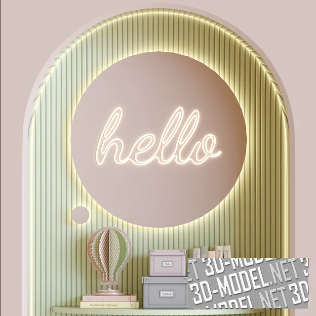 В правой части мебельного блока обустроена арочная ниша с отделкой из светло-салатовой вертикальной наборки мелкой рейкой. В арке смонтирован нюдовый консольный стол с выдвижным ящиком, пара салатовых книжных полок и круглое панно со скрытой подсветкой и светящейся надписью «hello».