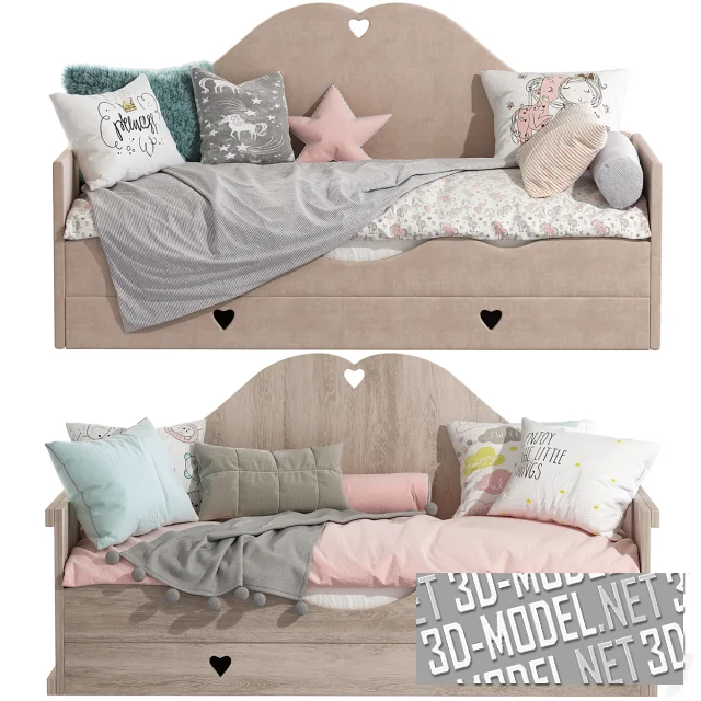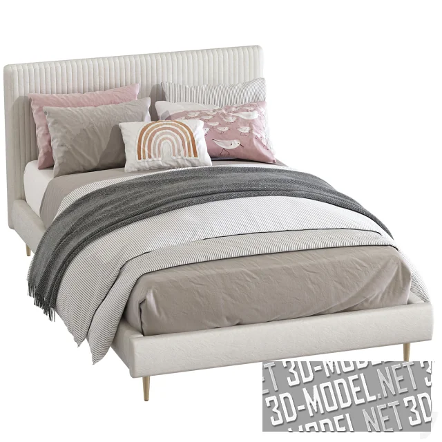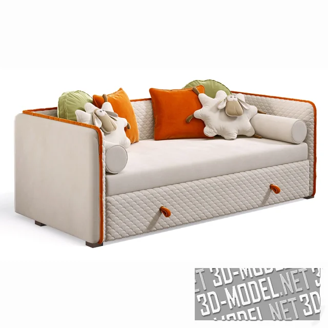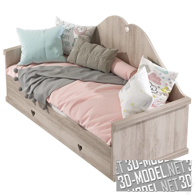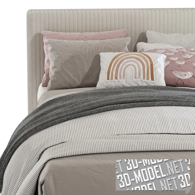 Детская спальня (дизайнеры: K Hagberg/M Hagberg) в стилистике океанского пляжа с кроватью-кушеткой ТАРВА (IKEA, 210х71х88см), прикроватной тумбой из деревянных реек НЕСНА (IKEA, 36х45х35см), постельным бельем ОФЕЛИА ВАСС и подушками ОТТИЛЬ, САНЕЛА, БЛОРИПС, Coastal Blue Waters Coral. На полу - песочного цвета прямоугольный ковер ВЕСТБРИК (IKEA, 80х150см).