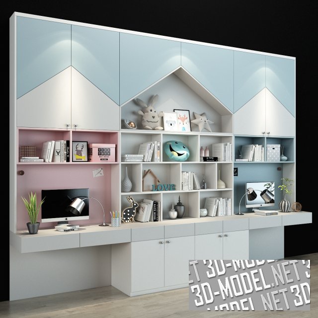 Мебельная коллекция Miss Bunny, авторская разработка бренда EFI Concept Kid для серийного производства. Гарнитур содержит рабоче-учебную зону для ребенка (размер 1600 х 600 х 2100 мм), а также диванчик и зону для просмотра телевизора (габариты тв-тумбы 1200 х 600 х 450 мм).