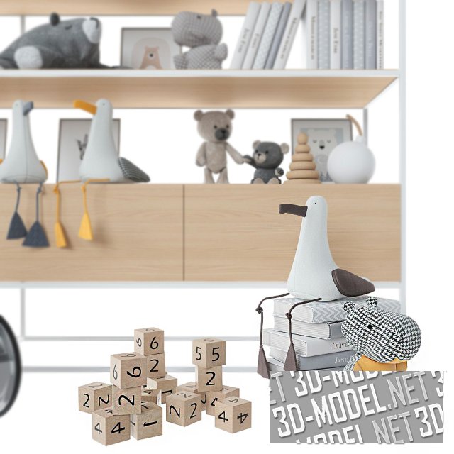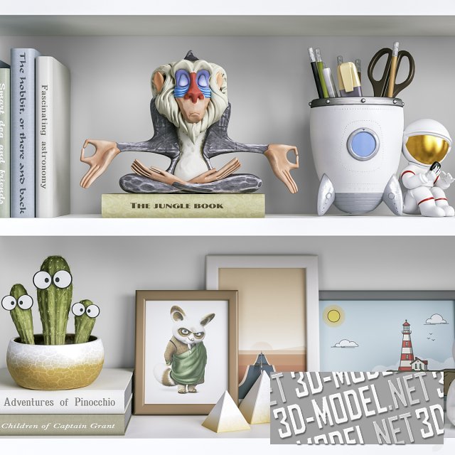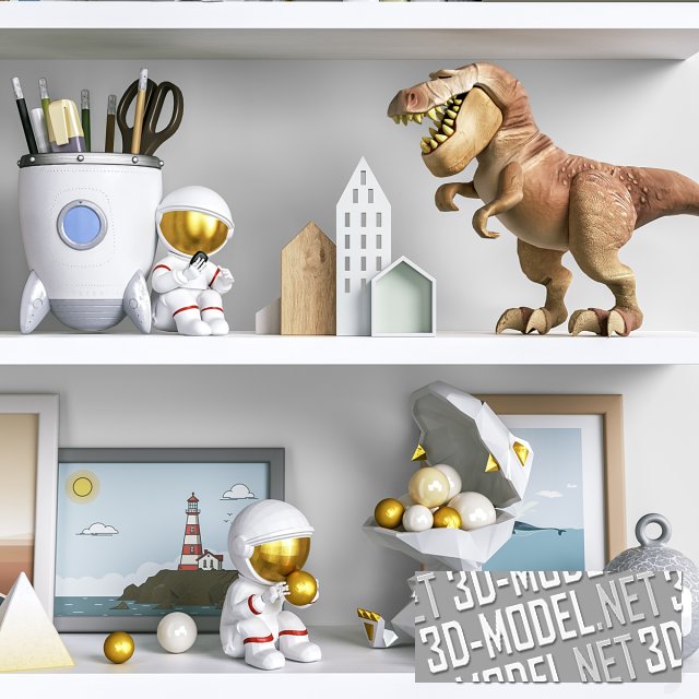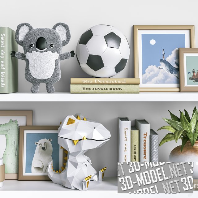 На широких белых полках находятся декоративные вазы с небольшими зелеными растениями, фигурка диснеевского персонажа Рафики, интерактивная игрушка-робот Pocket Robot (Jiabaile), несколько больших книг в светлых переплетах, фигурка динозавра из набора «Хороший динозавр», декоративная ваза светло-зеленого цвета в виде фигурки льва с растением внутри, композиция из домиков, декоративная фигурка-шкатулка «Динозавр», подставка для карандашей «Астронавт» с ручками, фломастерами и ножницами, фигурка-статуэтка «Астронавт», мягкая игрушка «Коала», детский фотоаппарат, фигурка «Динозавр», футбольный мяч, декоративная гиря, пирамидки,