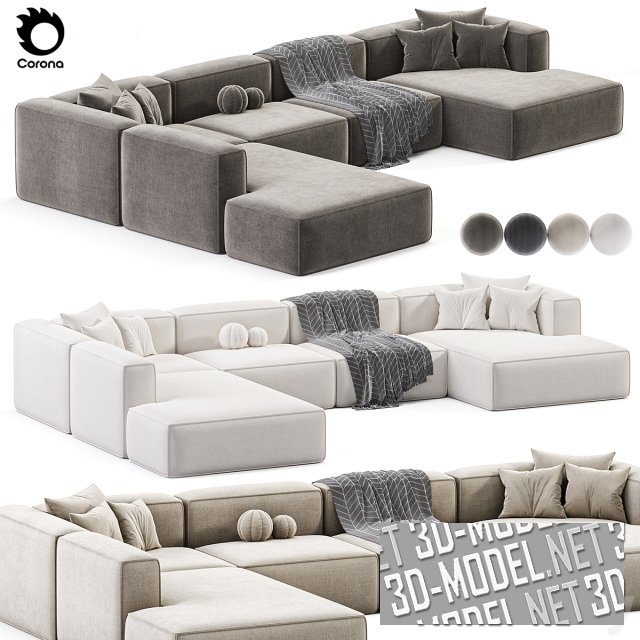 Современный модульный диван с низкой прямой спинкой и прямолинейными массивными мягкими элементами сидений без ножек и цоколя. Секции в базовом положении соединяются в П-образную ассиметричную конструкцию с габаритом: 469,67х279,42х113см. Обивка мягких элементов дивана представлена в четырех вариантах: белом, песочном, сером и черном. Темно-серый плед с белым контурным геометрическим орнаментом, маленькие квадратные и шарообразные подушки в чехлах из обивочной ткани дополняют сцену.