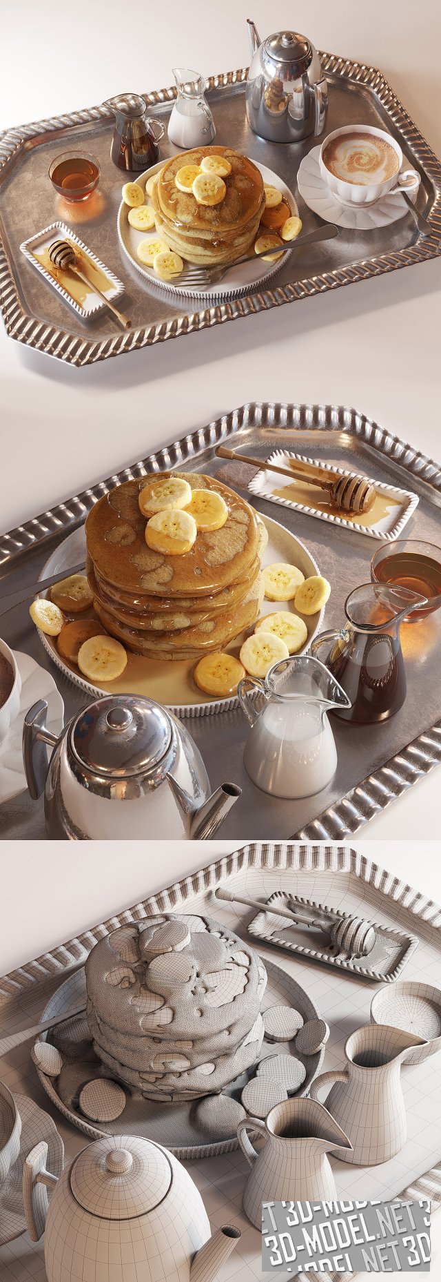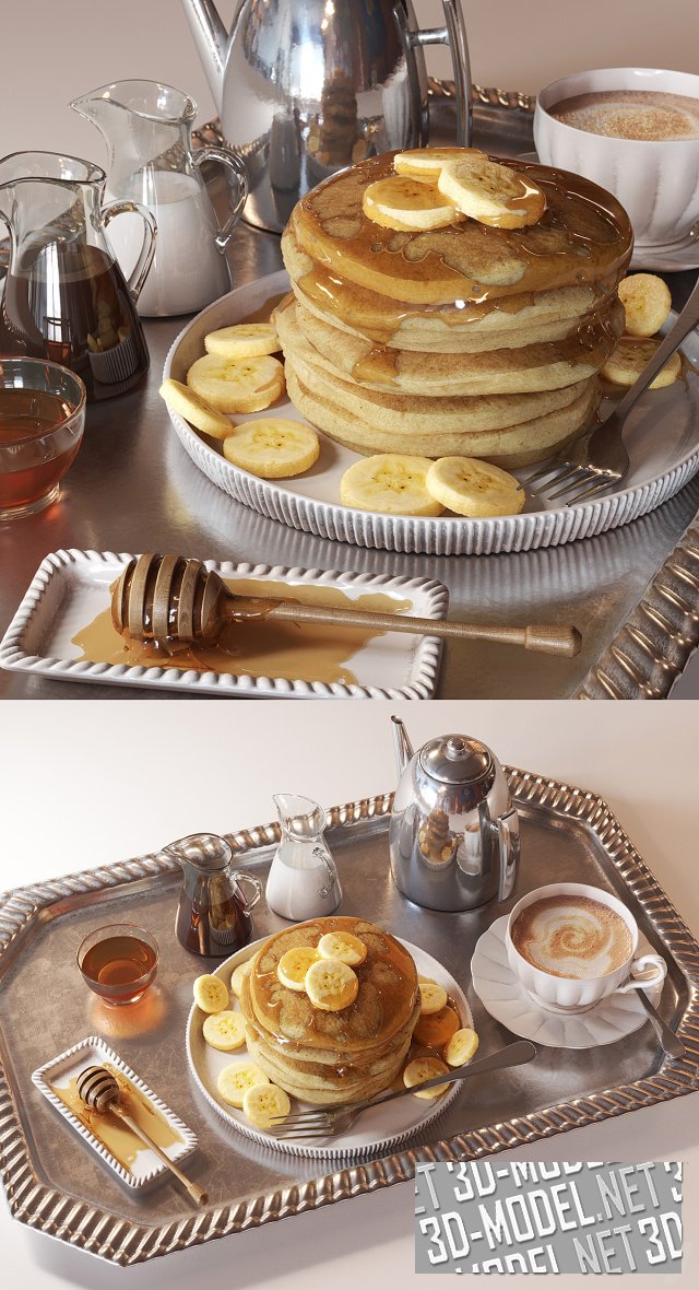 Аппетитный натюрморт с завтраком на прямоугольном со срезанными углами подносе. Поднос изготовлен из серебристого металла и декорирован рельефным орнаментом по периметру. На подносе белая тарелка с панкейками, залитыми медом и присыпанные нарезанными кружочками бананов. Прямоугольная подставка со специальной деревянной ложкой-веретеном для меда стоит рядом. Кроме этого на подносе: серебристый кофейник, чашка с кофе с молоком на белом блюдце, два прозрачных графинчика (с молоком и сиропом) и стеклянная плошка с медом.
