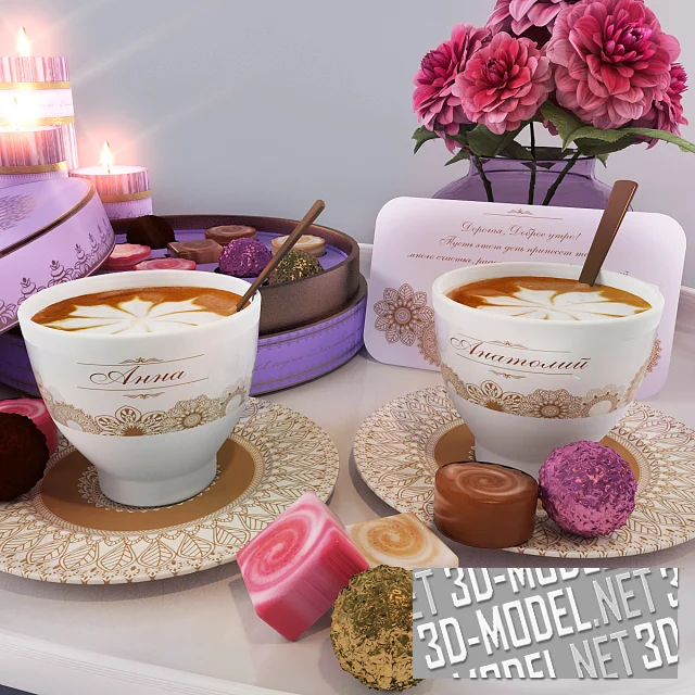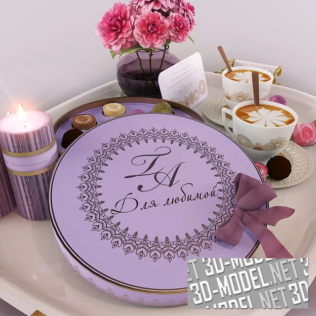 Что может быть романтичней завтрака в постель? Только завтрак в постель, сервированный невероятно изысканно и с любовью! Именно так выглядит эта детализированная 3D-модель, которая добавит любой визуализации элегантности и уникальности, предлагая эстетичный вариант для различных дизайнерских проектов. На большом подносе собрано все небходимое для создания романтичной атмосферы - букет цветов, конфеты, ароматный кофе, горящие свечи и пр. Все текстуры присутствуют.