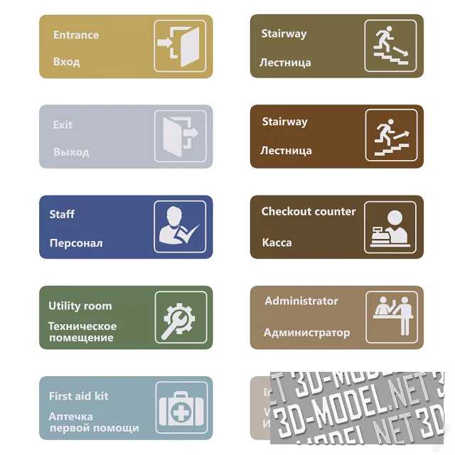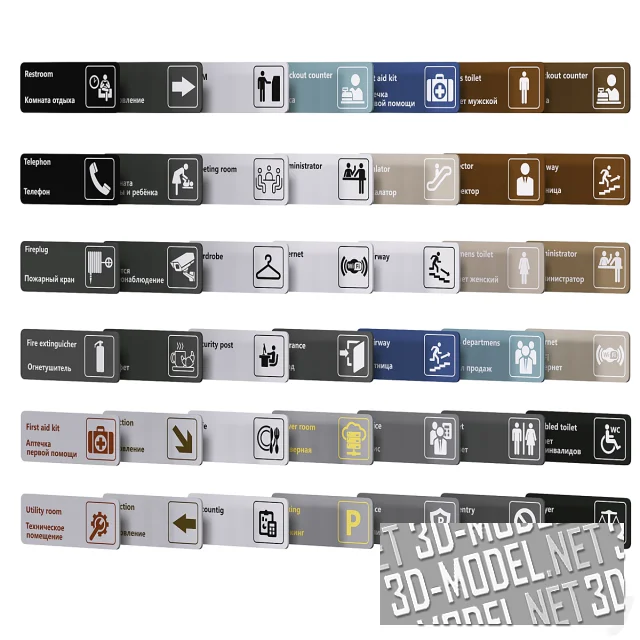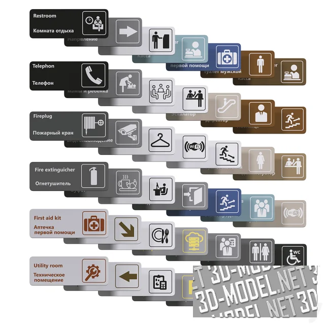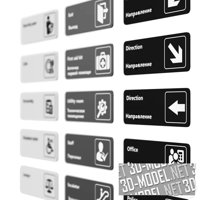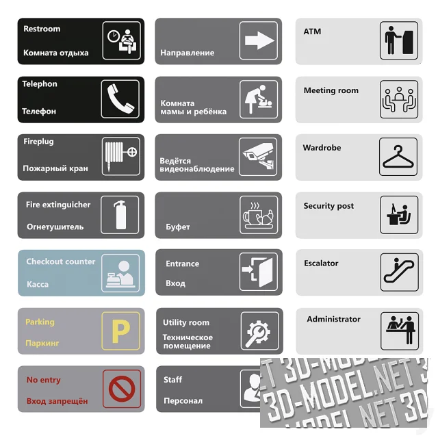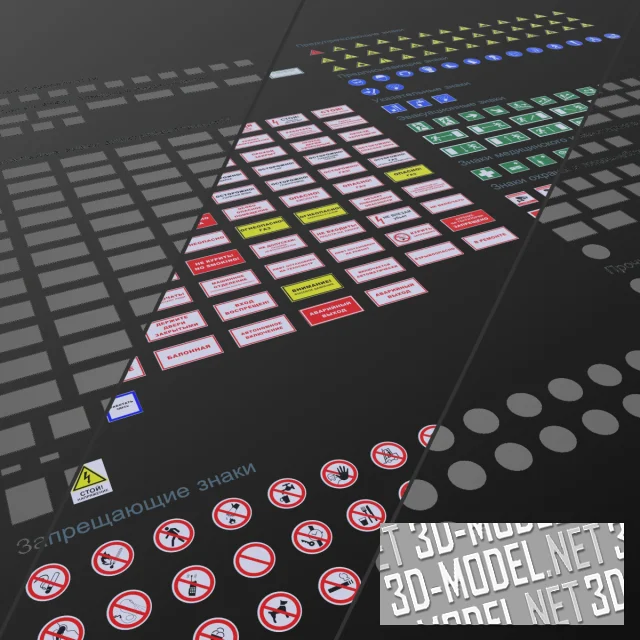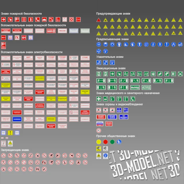 Большая коллекция дорожных знаков, предупреждающих и запрещающих табличек для размещения в городской среде (в нужных местах вдоль дорог, на витринах магазинов, на площадках, пожарных щитках, электроприборах и установках, этикетках, в общественных местах и прочее). Надписи на стандартизированных знаках представлены на русском или английском языках.