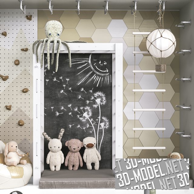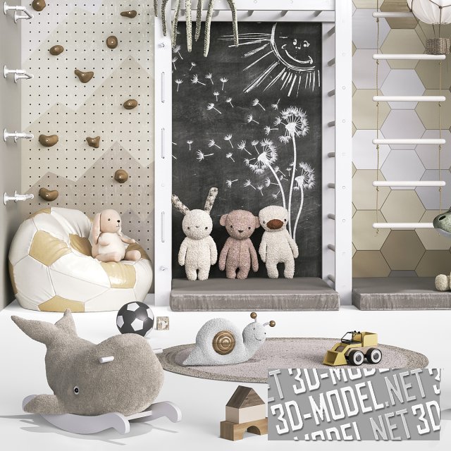 Современный стеллаж с полками и специальными отсеками для различных вещей. Внизу расположены 6 ящиков для хранения игрушек, конструктора Lego и кубиков. Верхние полки заполнены книгами, канцелярией, декоративными фигурками, игрушками и мячом. Рядом со стеллажом большая черная доска для рисования мелом. Привлекательный функциональный набор подойдет в интерьер любой детской комнаты.