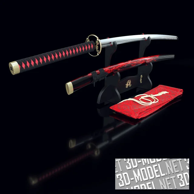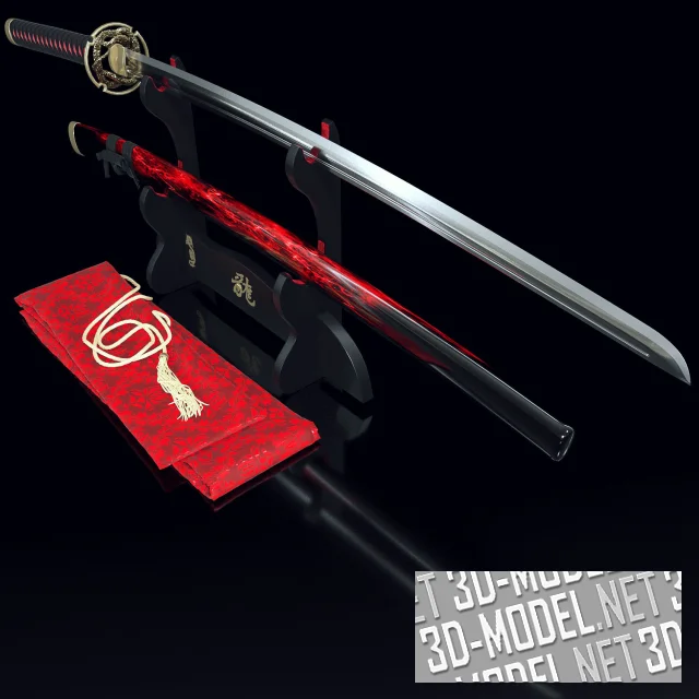 Черно-красный японский меч на черной деревянной подставке. Подставка двойная, с катаной наверху и красно-черными ножнами с живописными разводами. У основания подставки, декорированной золотистыми иероглифами, аккуратно сложен шелковый чехол с красным орнаментом и белым шнуром. Цуба катаны (гарда) - из золотистого металла, с изображениями дракона. Рукоять декорирована черным шнуром по красному фону.
