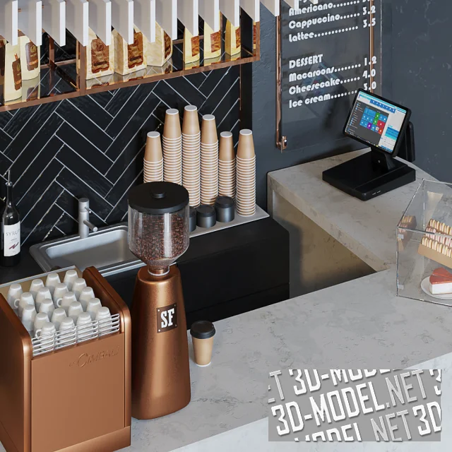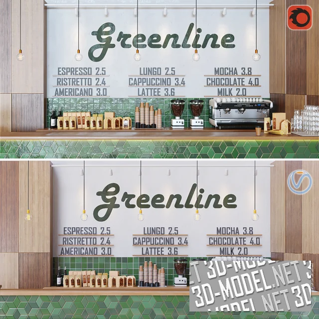 Над фартуком размещена вывеска на белом фоне с надписью «Greenline» и списком ассортимента с ценами. Над барной стойкой висят ретро-лампочки на длинных шнурах. Над задней стенкой смонтированы белые споты на горизонтальной белой штанге. На столешницах оборудование для кафетерия: кассовый аппарат, посуда, профессиональная кофемашина, кофемолки, посуда, сиропы, кофе в пакетах, одноразовая посуда.