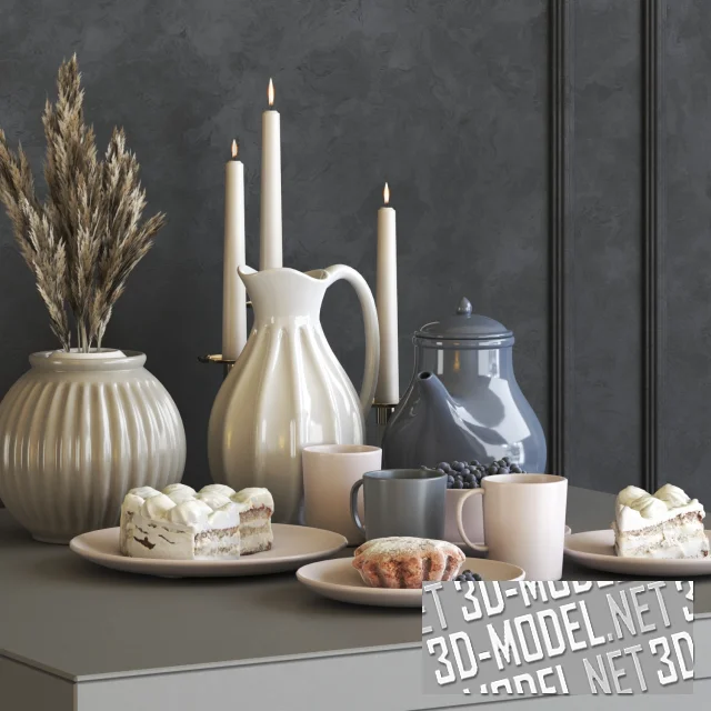 Приятный комплект для создания уютной атмосферы в любом пространстве. В основе набора предметы посуды из IKEA (бежевый сервиз и кружка серии DINERA, вазы VANLIGEN, подсвечники GLITTRIG (цвет слоновая кость и золотистый). Дополняет сет букет пампасной травы в одной из ваз, а также сладости (маффины, торт и ягоды).