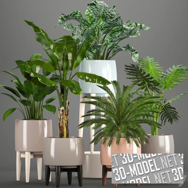 Пять современных керамических горшков на четырехногих деревянных подставках с растениями. Круглые в сечении горшки имеют разную высоту и выполнены из керамики разных цветов, пастельных тонов (очень светлый голубой, светлое капучино, светлое какао, пудровый). Высота и отделка деревянных подставок тоже разная (белый, светлое дерево, красно-коричневый полупрозрачный лак, венге). В горшки высажены такие растения как банан, алоказия, филодендрон, цикас, аспидистра.