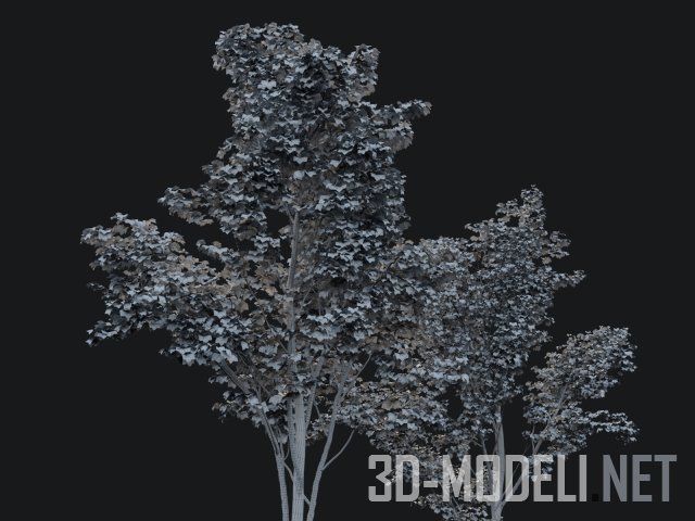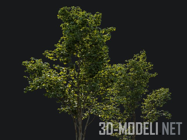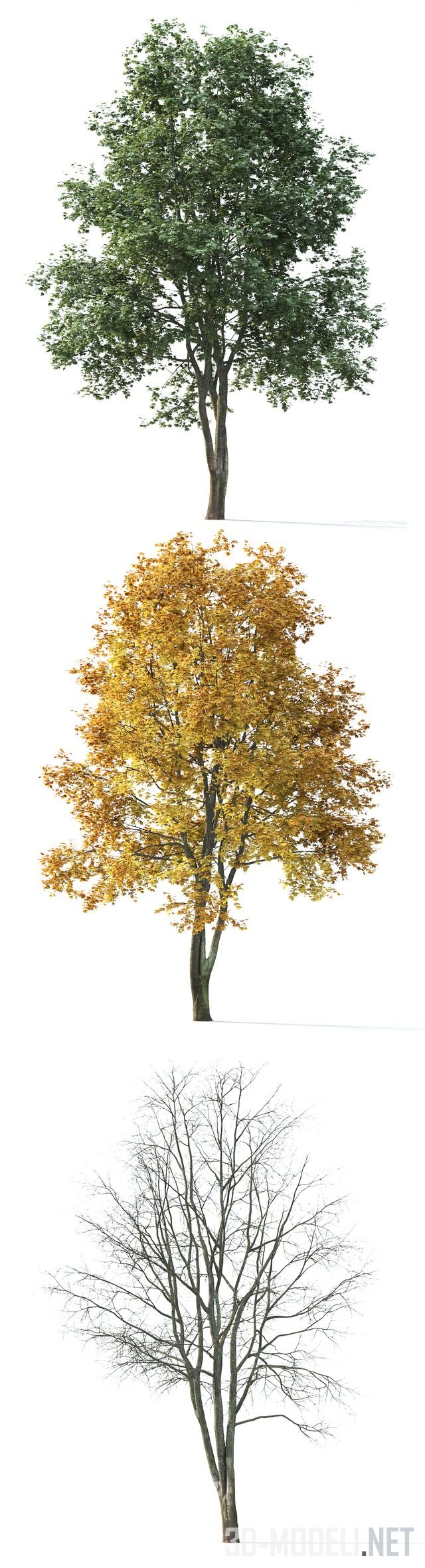 Реалистичная копия пожелтевшего осенью клена. Высота дерева достигает 14 метров. Качественная и детализированная трехмерная модель может быть использована для реалистичного наполнения леса и других экстерьерных проектов.