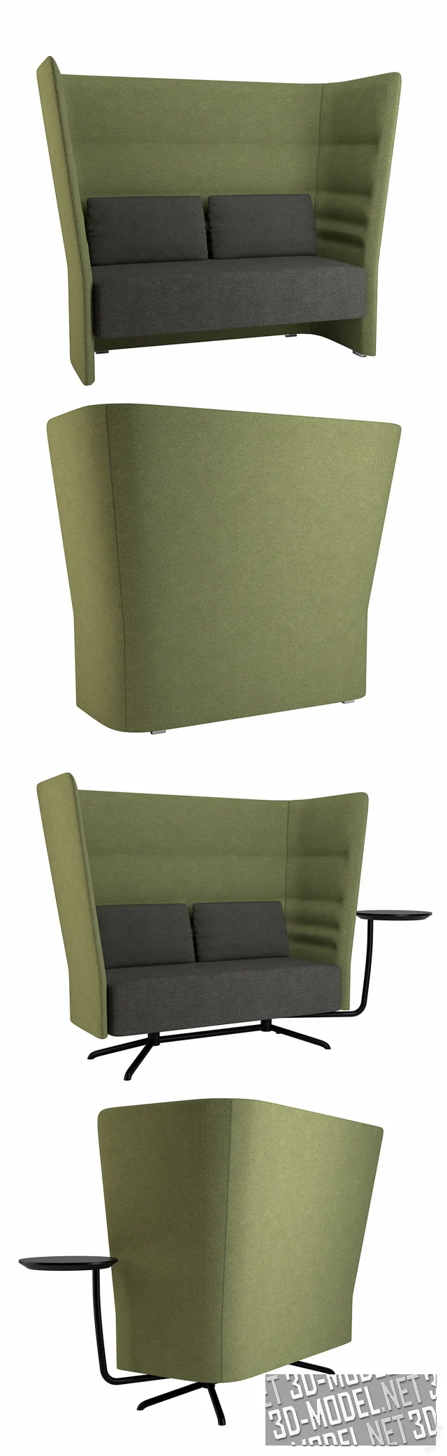 Современный мягкий диван Cell128 с высокой мягкой спинкой и боковыми подворотами, формирующими уютную кабинку в клубе, кафе, ресторане, современной гостиной. Представлено три варианта с одинаковыми мягкими элементами и разными вариациями ножек (с опорой на спинку, с черной металлической крестовиной и откидным круглым столиком, на двух деревянных крестовинах и с отодвигаемым круглым столиком на черном кронштейне). Корпус дивана и подушки обиты серым текстилем. Спинка с боковинами - материалом оливкового цвета.