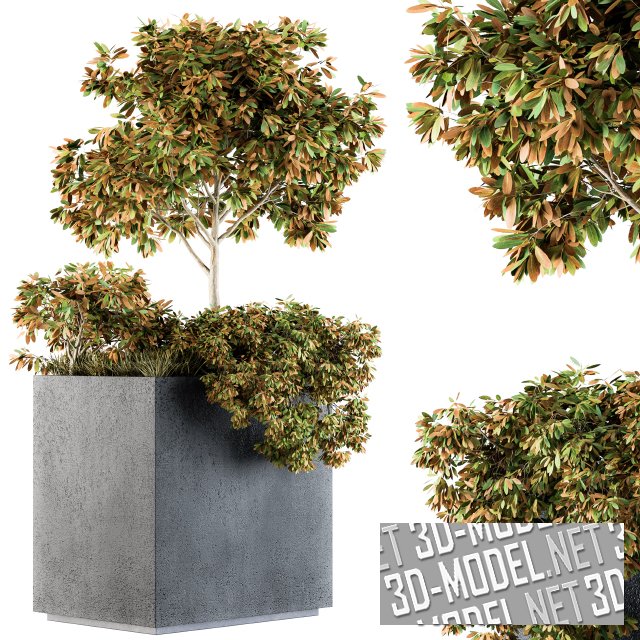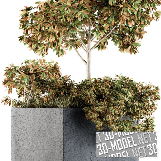 Элемент современного ландшафтного дизайна или городской среды в виде высокого бетонного контейнера прямоугольной формы с растениями. В контейнере - небольшое дерево и кустарники с мелкими овальными листочками коричневатых и зеленых тонов. Поверхность грунта засеяна газонной травой.