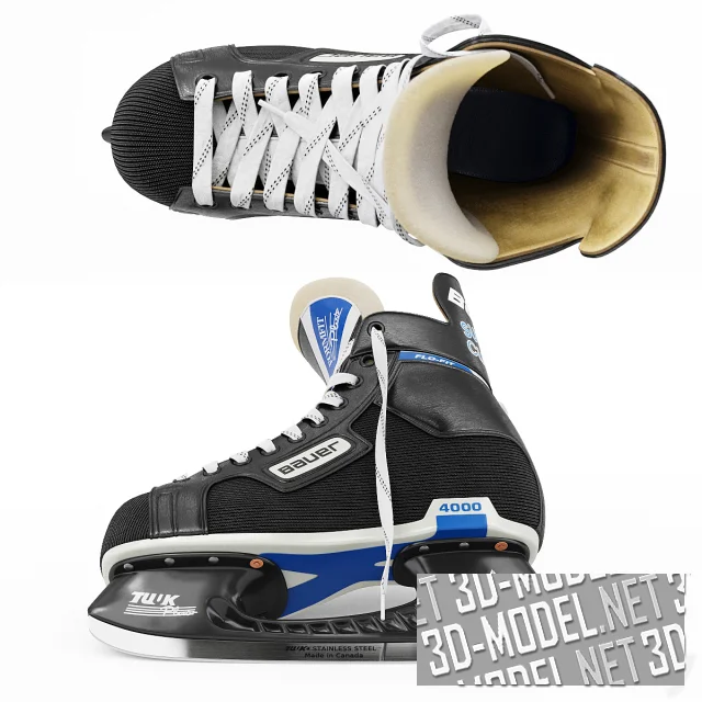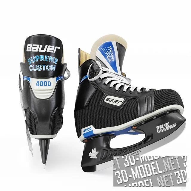 Профессиональная спортивная обувь для игры в хоккей на льду - коньки Bauer Supreme Custom 4000 Tuuk. Отделка черных ботинок скомбинирована из синтетической ткани и кожи, декорирована белыми и синими надписями. Шнурки белые, с двойным темным пунктиром. На лезвия коньков нанесена надпись: «Tuuk. STAINLESS STEEL. Made in Canada». Внутренние поверхности ботинок отделаны светлым материалом со следами ношения.