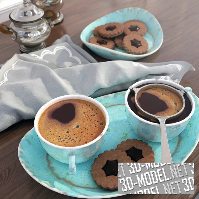 Реалистичная 3D-модель с тщательной проработкой материалов и деталей. Правдоподобно переданы текстуры керамики и металла, мягкость ткани и структура печенья. Такой объект отлично подойдет для визуализации интерьеров, рекламных проектов или атмосферных рендеров, создавая настроение комфорта и элегантности.