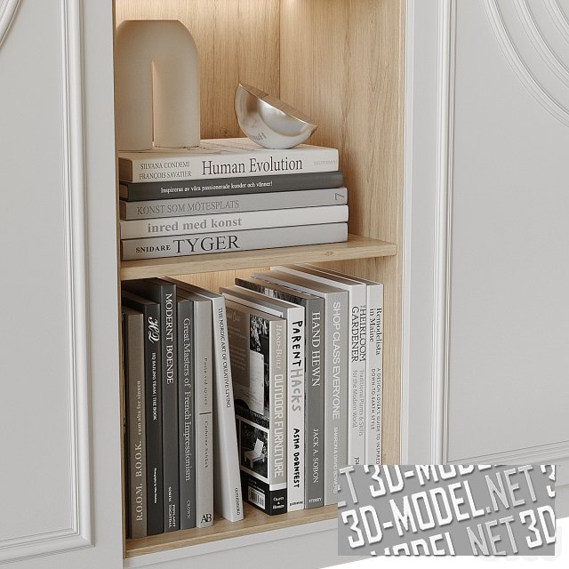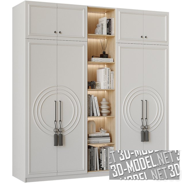 Трехсекционный белый шкаф в стиле неоклассика. Две секции с глухими створками размещены по бокам от центральной узкой секции из светлого дерева с открытыми книжными полками со скрытой подсветкой. На полках книги, аромо-диффузор, керамика, низкополигональная фигурка слоника, подпорка для книг в виде мраморной скалы.