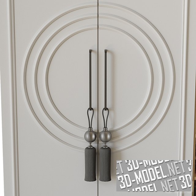 Глухие секции шкафа разделены на две большие створки и две небольшие на антресолях. Большие створки украшены тройными рельефными кольцами вокруг изящных тонких черных ручек. На вертикальных скобах ручек висят декоративные темно-серые кисти с серебристыми шарами. Габарит шкафа: 225 х 60 х 240 см.