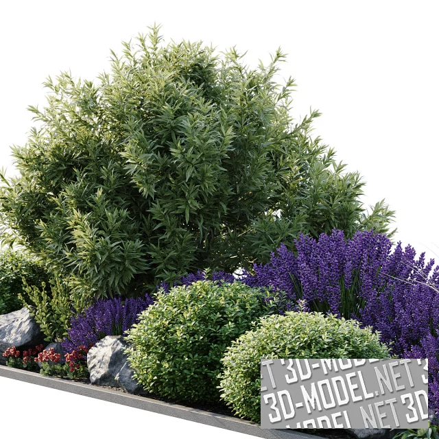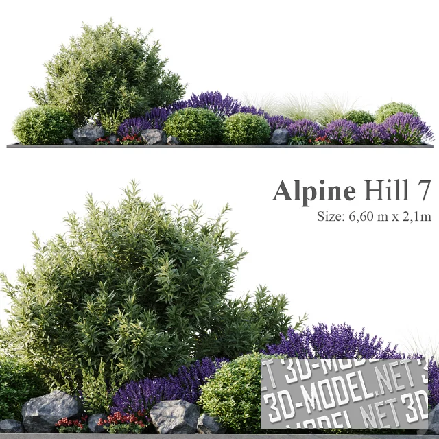 Живописная альпийская горка, вписанная в прямоугольную клумбу габаритом 6,6х2,1м и ограниченная серым бордюром. Наполнение выполнено из шарообразных кустов ивы и самшитов, цветущих фиолетовых кустов лаванды, кустов артроподиума и невысоких растений с красными цветками.