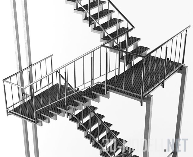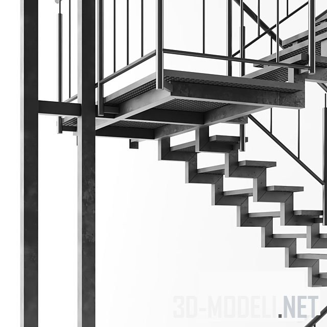 Современная лестница с деревянными ступенями, перилами, реечным декором стены и стеклянным заполнением перил. Металлические косоуры темно-серого цвета. Габарит модели из двух маршей и площадки: 430х200х300см.