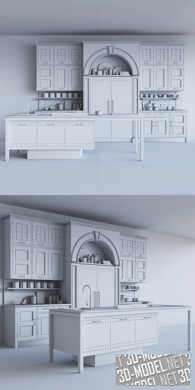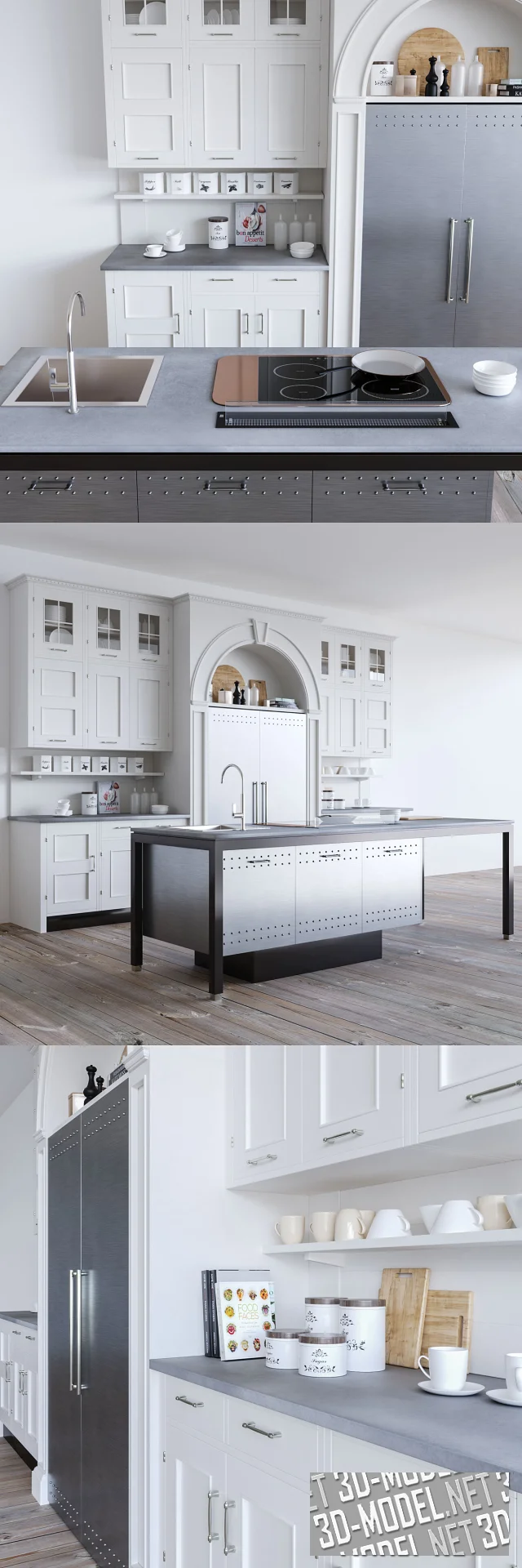 Современная кухня Marchi Cucine Montserrat, созданная на стыке стилей Лофт и неоклассика. Белые поверхности рамочных фасадов, пилястры, карниз и арочная ниша гармонично сочетаются с черным каркасом и ножками острова, изготовленными из металлической профильной трубы квадратного сечения и серебристыми брашированными и «проклепанными» плоскостями фасадов острова и двухстворчатого шкафа.