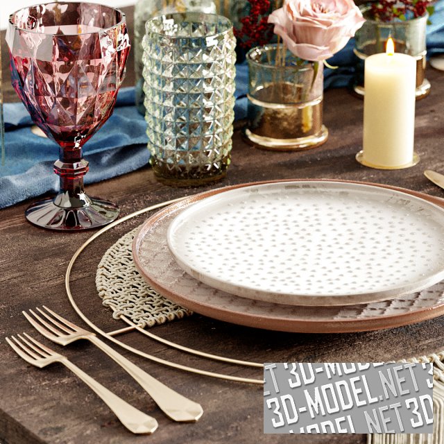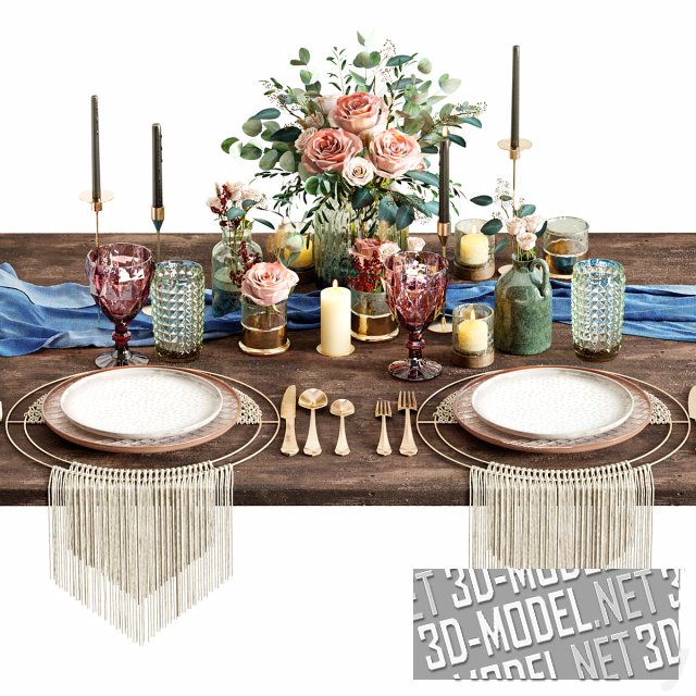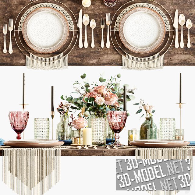 Нарядная, яркая сервировка стола. В комплекте предметы посуды (тарелки, бокалы), свечи, столовые приборы. Украшения в стиле макраме и пышный букет создают непринужденную атмосферу.