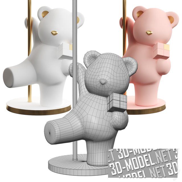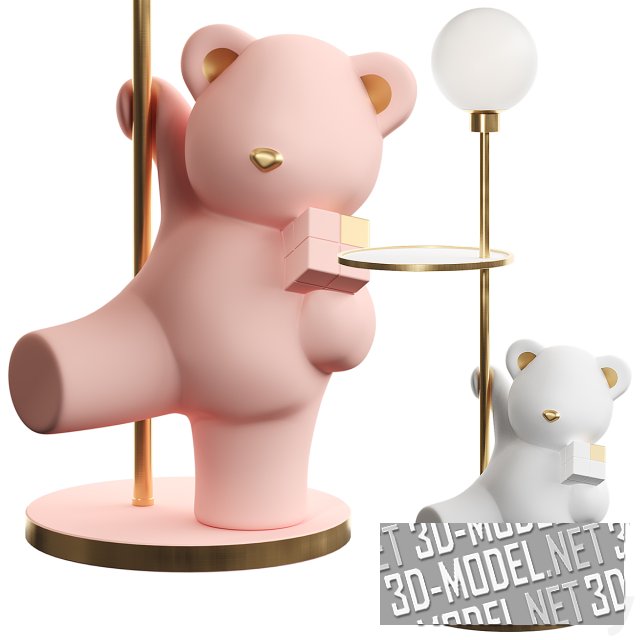Интересный напольный светильник с круглым белым плафоном и пластиковой фигуркой медвежонка, который в лапе держит кубик рубика. Торшер представлен в двух вариантах: в первом мишка белого цвета, а во втором – розового. Длинный стержень с отделкой из позолоты смотрится красиво и изящно.
