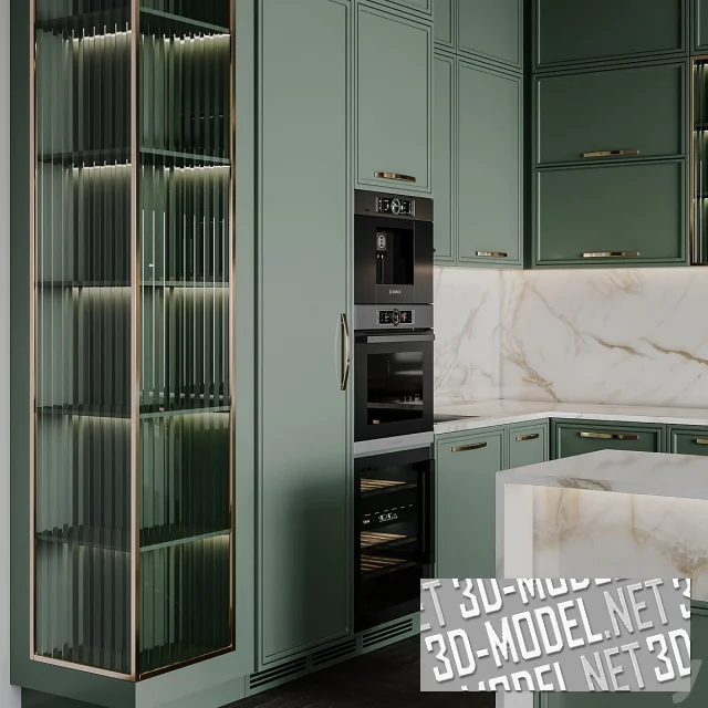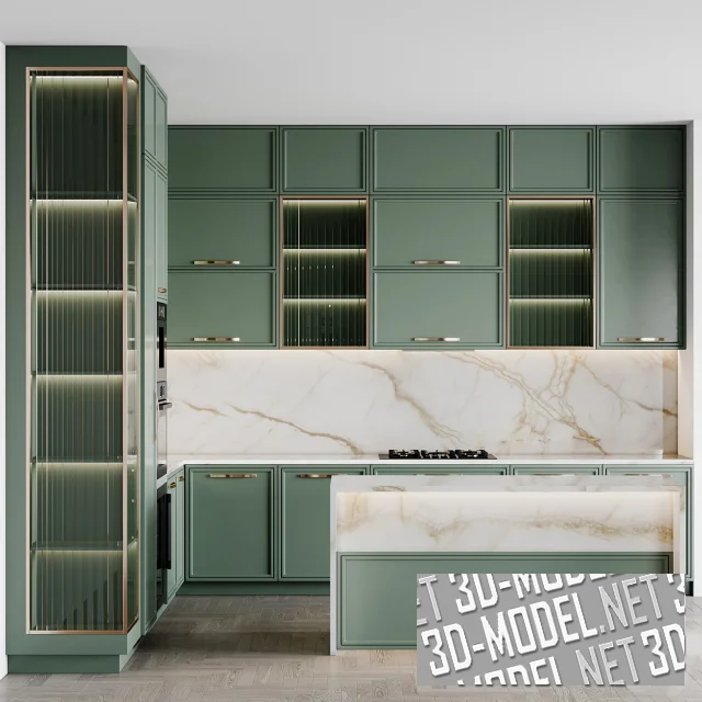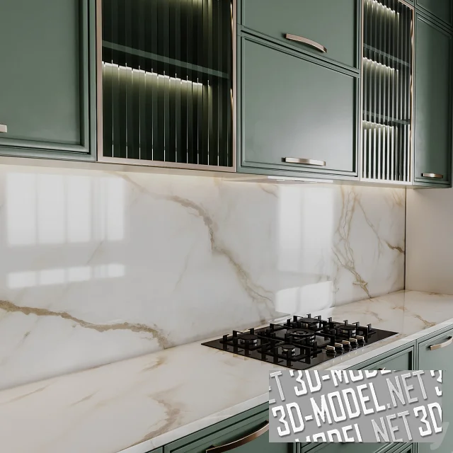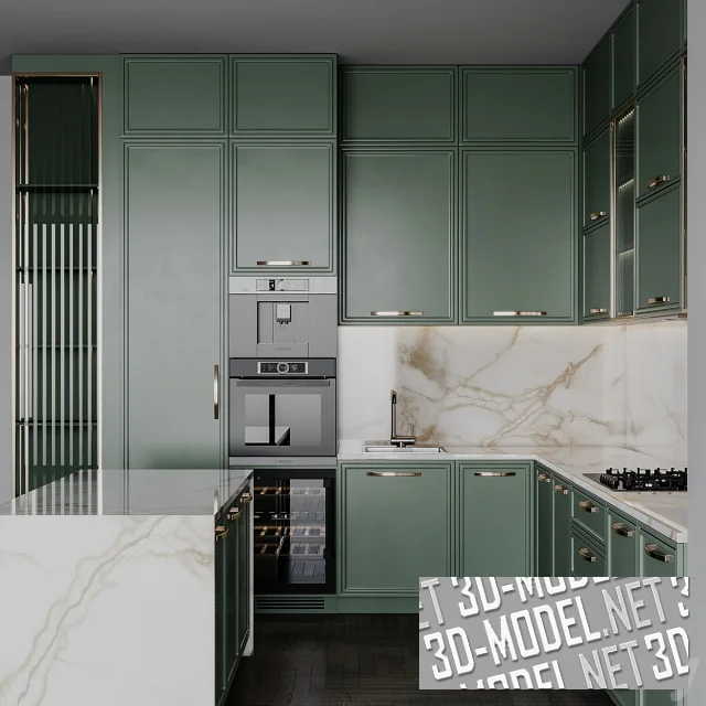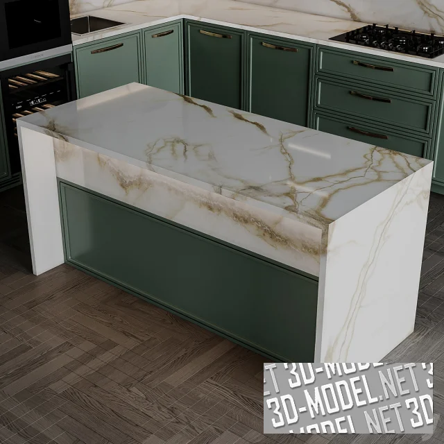 Набор мебели и техники для обустройства кухни в стиле модерн. Мраморный остров сочетается с отделкой кухонной стены. Мебель представлена в зеленых тонах.