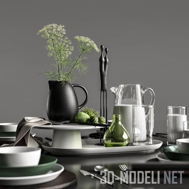 Спокойная и красивая сервировка, составленная из предметов посуды и декора белого, черного зеленого оттенков. Все вместе смотрится очень органично - тарелки, поднос, столовые приборы, графин с молоком, а также декоративные аксессуары в виде букета и оригинальной статуэтки.
