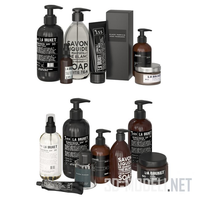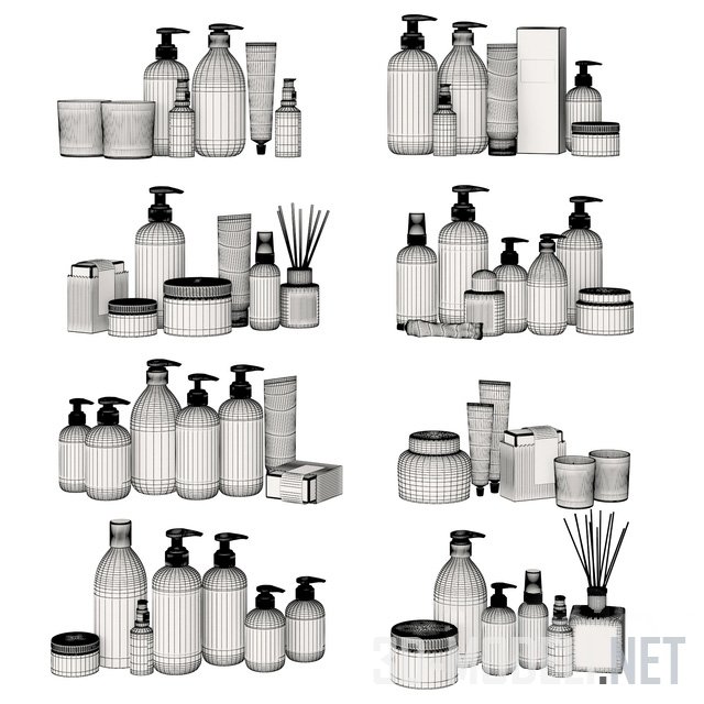 Различные предметы для наполнения интерьера ванной комнаты. В наборе множество средств и аксессуаров. Тюбик с кремом, металлические корзинки с туалетной бумагой, полотенцами, жидким мылом в диспенсере и морской водой, мраморная мыльница, пемза, керамическая ваза с пампасной травой и абстрактное черно-белое панно в деревянной рамке.