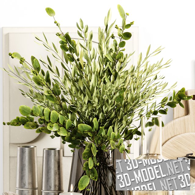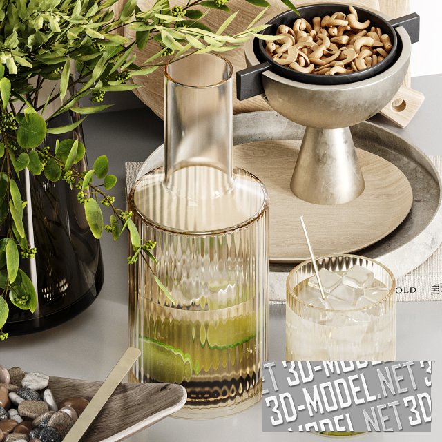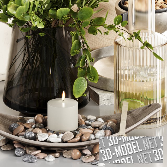 Красивый набор для интерьера современной кухни. На столе стоит стеклянная ваза с большим букетом зеленых листьев двух разновидностей эвкалипта, набор деревянных разделочных досок, деревянная подставка в виде лодочки, в которой стоит горящая свеча и насыпаны мелкие гладкие цветные камешки; стеклянный графин и стакан с соломинкой - в них напиток, кусочки льда и кружочки лайма.