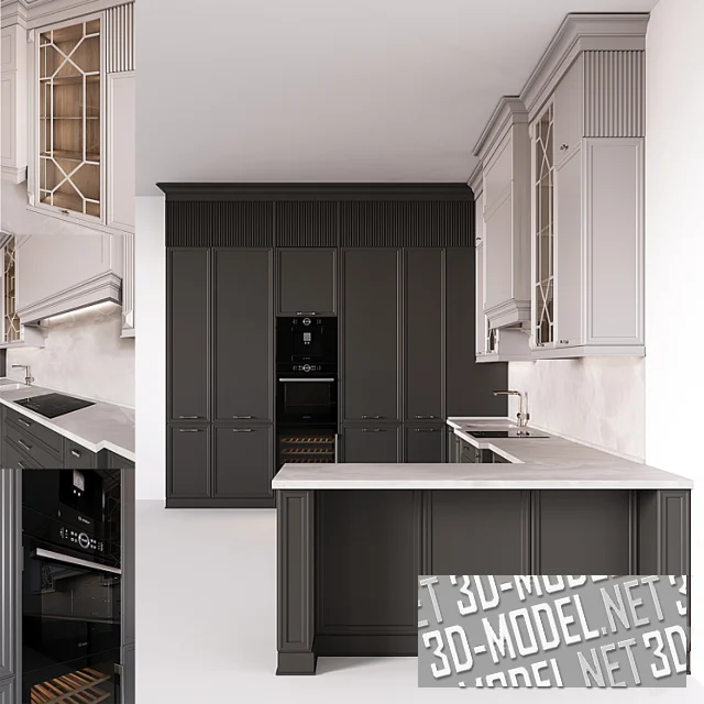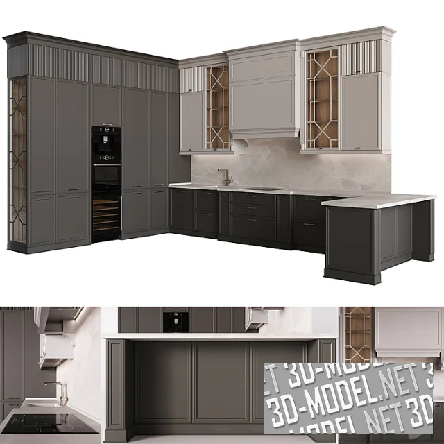 Угловая современная, темно-серая с бледно-бежевым кухня в стиле «Неоклассика». Основная столешница из светло-бежевого мрамора сворачивает на 90 градусов и образует дополнительную поверхность в правой части блока. Слева от столешницы смонтирован ряд высоких шкафов, с витриной в левом торце и со встроенной кухонной техникой в черных корпусах в третьей секции. Остальные четыре секции закрыты парами глухих фасадов. Угловая секция, в месте сопряжения с навесными шкафами и столешницей с нижним ярусом, выполнена в темно-сером цвете. Блок со шкафами декорирован в верхней части вертикальными фрезерованными канавками и багетным венцом.