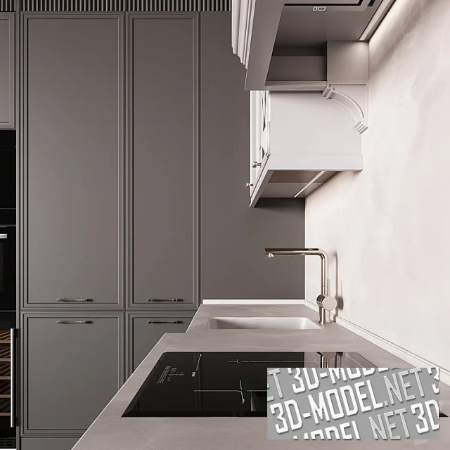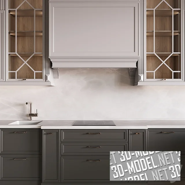 Нижние тумбы, под столешницей - темно-серые. Фасады выдвижных ящиков и шкафов отделаны багетными профильными рамками. Фартук из бледно-бежевого мрамора. Корпуса навесных шкафов и их фасады бледно-бежевые, в тон мрамора. Перемычки на стеклах витрин в левой части шкафов и на двух секциях навесных шкафов образуют простой геометрический орнамент. Верхние фасады на крайних секциях навесных шкафов декорированы фрезеровкой и увенчаны багетным профилем. В столешницу врезана черная варочная панель и небольшая квадратная раковина со смесителем. Встроенная вытяжка оформлена в виде каминного дымохода с багетными профилями, консолями и пилястрами.