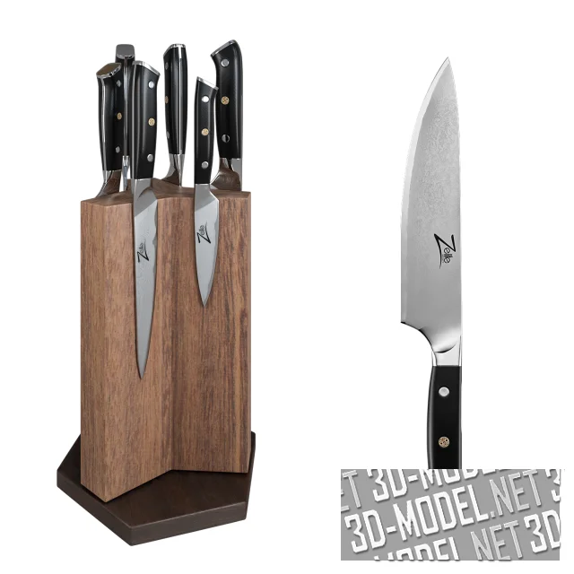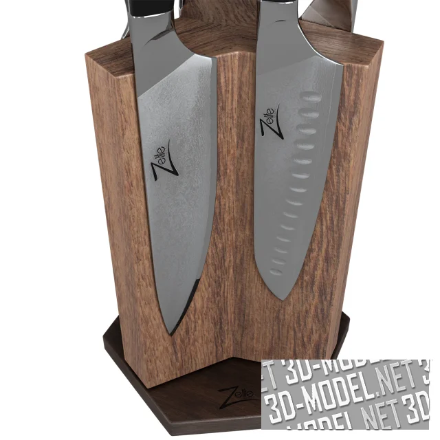 Деревянная подставка с кухонными ножами японской серии Zelite Alpha-Royal. Подставка имеет шестигранную темную площадку и основную часть в виде трех-лучевой дубовой стеллы со встроенными магнитами. Ножи конструкции «фулл-танг» с черными накладками на ручках, двумя заклепками и сборным пином в черных накладках рукояток. Клинки выкованы из дамасской стали. Набор из пяти ножей перекрывает всю линейку потребностей современной кухни (поварской, хлебный, сантоку, нож для филе Gokujo, универсальный, для чистки овощей).