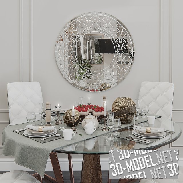 Круглый стол 30F-908 со стеклянной столешницей, четыре одиноковых стула с отделкой белого цвета представляют собой уютный функциональный набор мебели для обеденной зоны. На столе скатерть из хлопка. Красивая сервировка с бокалами определяет праздничную атмосферу. Также стол украшен керамической вазой с позолотой 18H2533M-7. На стене висит круглое декоративное зеркало от Garda decor. Зеркало повторяет форму столешницы обеденного стола.