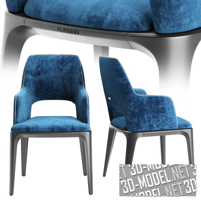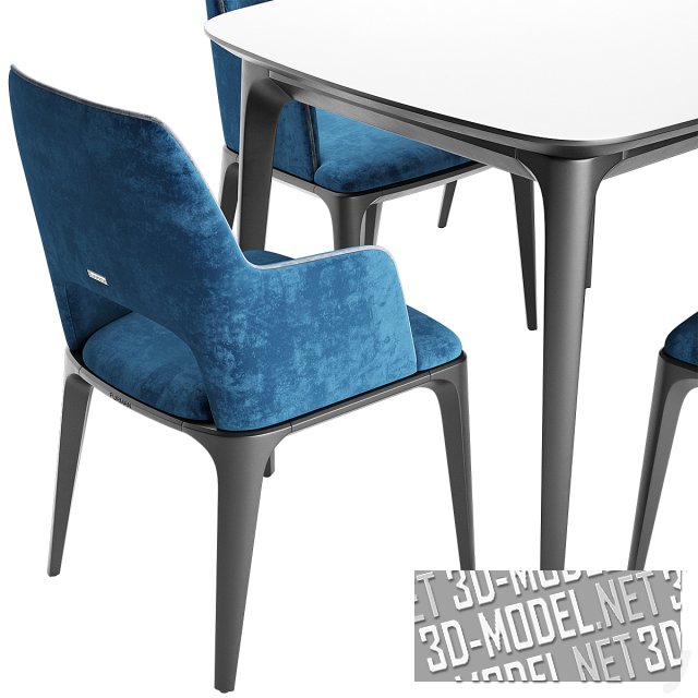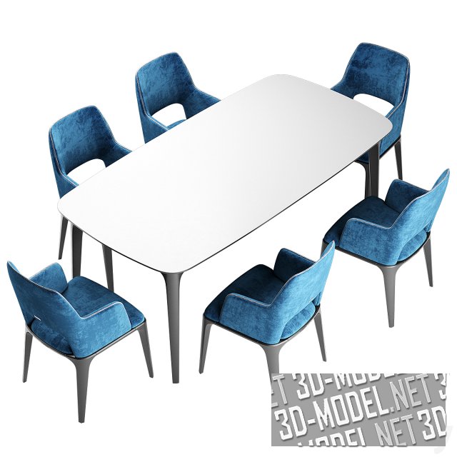 Современный обеденный стол с белой столешницей прямоугольной формы и скругленными уголками. Возле стола находятся мягкие стулья Play FURMAN с подлокотниками и вырезом в спинке, обтянутой синим велюром. Универсальный дизайн стола и стульев позволяет органично вписать их в любой интерьер. Габариты: стол 1800 х 900 см, стул 500 х 550 х H840см.