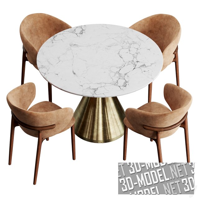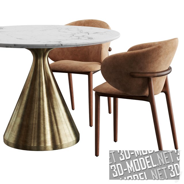 Комплект обеденной мебели стол Silhouette и стулья Mela. Стол Silhouette от West elm (d110/h76см), с круглой столешницей из белого с черной прожилкой мрамора и конусообразной опорой из брашированой латуни. Стулья Mela от Regular Company для Artisan изготовлены на основе каркаса и ножек из тонированного дуба. Мягкое сиденье и огибающая спинка обтянуты плюшем карамельного цвета. Габарит стула: 52х54х78см.