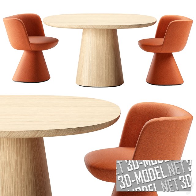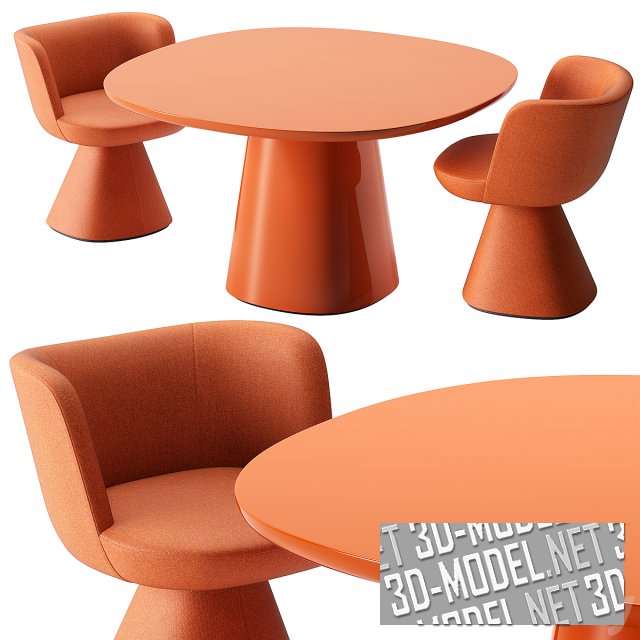 Современный комплект для кафе или для небольшой обеденной зоны. Набор с круглым столом и оранжевыми стульями. Стол Allure от Monica Armani (d125/h72см) представлен в двух декорах - с оранжевой глянцевой конусовидной опорой и оранжевой столешницей и с опорой и столешницей с текстурой светлого дерева. Стулья Flair от B&B Italia (габарит: 60х60х73см) дублируют форму опоры стола в виде усеченного конуса. На опоре - эргономичное мягкое сиденье с огибающей спинкой. И опора и сиденье обиты оранжевой текстурной тканью.