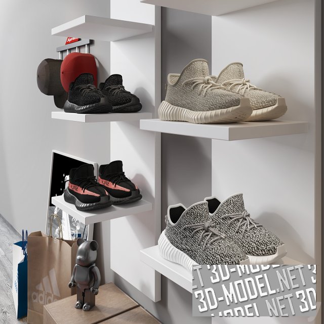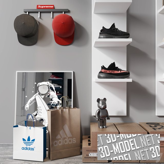 Обувь от бренда Adidas и бейсболки Supreme в отделе специализированного магазина. Кроссовки серии Yeezy boost размещены на белых полках. Бейсболки висят на вешалке с небольшой красной табличкой Supreme. Коробки, пакеты, рекламный постер с космонавтом и пара коллекционных фигурок Bearbrick в серебристом исполнении разместились на полу. В комплекте прямоугольный красный коврик с логотипом Supreme.
