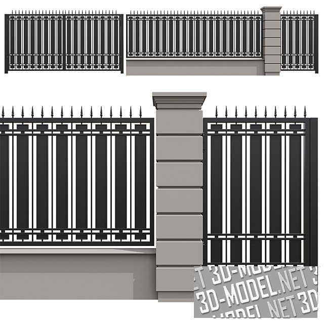 Набор составляющих ограды в классическом стиле. В наборе: часть забора с оштукатуренными цоколем и столбами и металлическим заполнением секций; калитка и двухстворчатые ворота. Столбы разделены горизонтальными канавками на панели, украшены небольшим фризом и накрыты квадратными крышками. Металлические заполнения выполнены в виде орнамента из узких вертикальных прямоугольников с коваными пиками по верхней кромке. Представлены два цвета наборов: серо-черный и песочный.
