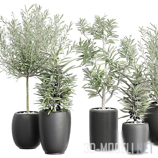 Пять разных по форме, но одного цвета цветочных горшков с оливковым деревом. Будет хорошим вариантом декорации интерьера как по отдельности, так и группой растений.
