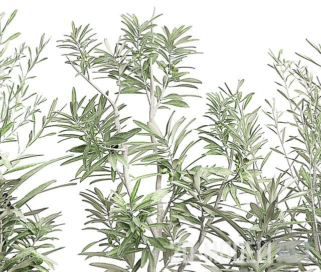 Оливковые деревья в формате кустов в крупных цветочных горшках. Один горшок - глянцевый на четырехногой металлической подставке. Второй декорирован под шпон дерева с сероватой текстурой и металлической нижней частью. На ветках оливы - зеленые и черные ягоды. олива