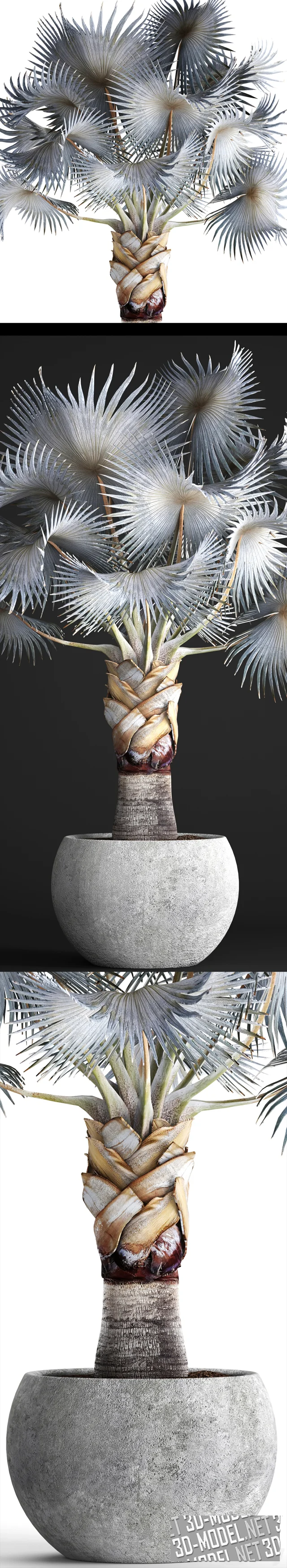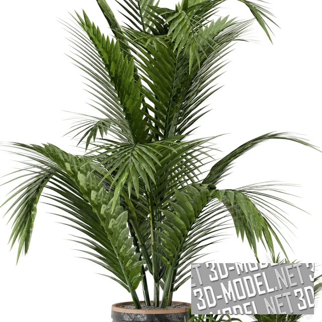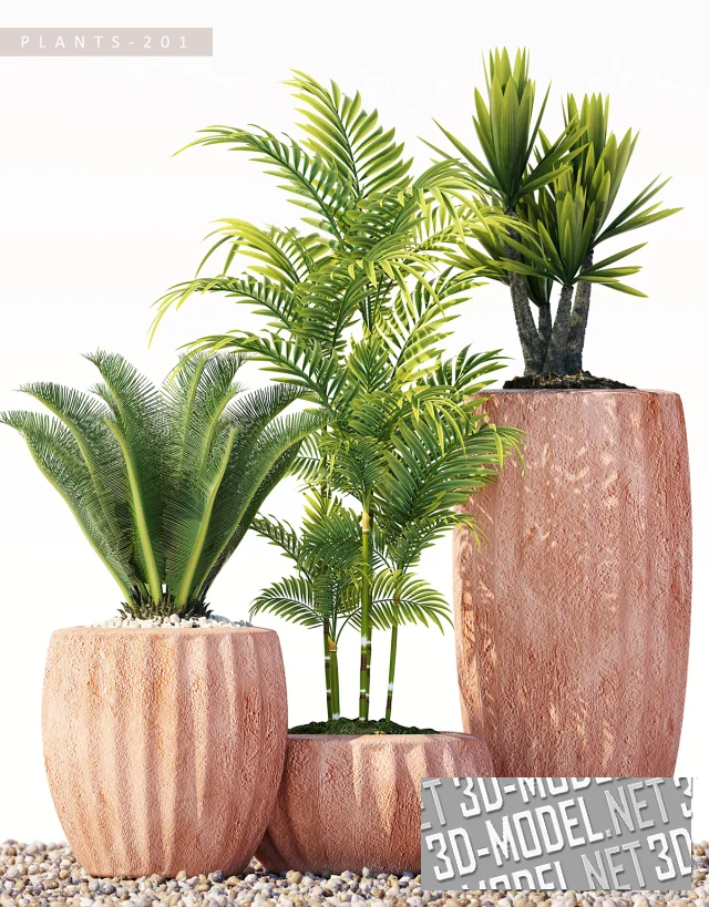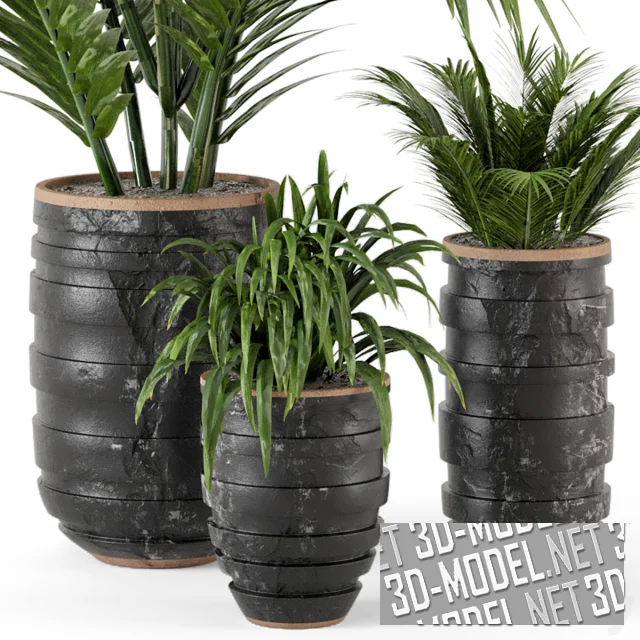 Три черно-коричневых керамических цветочных горшка в этно-стиле с растениями. Поверхности горшков рельефные, с неравномерными кольцами выступов и впадин. В большом горшке - пальма без ствола, с крупными перистыми листьями. В среднем - пальма поменьше. В меньшем горшке высажен пышный куст с узкими ланцетовидными листьями, растущими из грунта.
