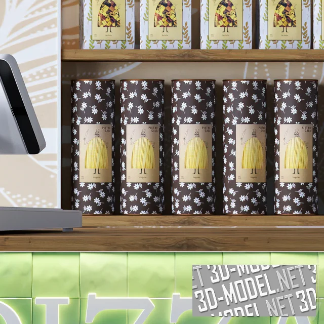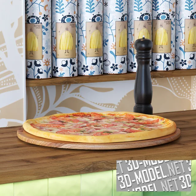 Отделанная красным кирпичом стойка в пиццерии. Имеет линию раздачи для самообслуживания, где есть все необходимое (подносы, хлеб, салаты, супы, десерты и соки, разные закуски и пр.), а также витрину с холодильником и необходимое оборудование. Такой комплект для кафе, бистро, другой точки общепита, с кассовым аппаратом, прилавком, кофемашиной, рекламными вывесками и пр. пригодится при разработке тематических проектов.