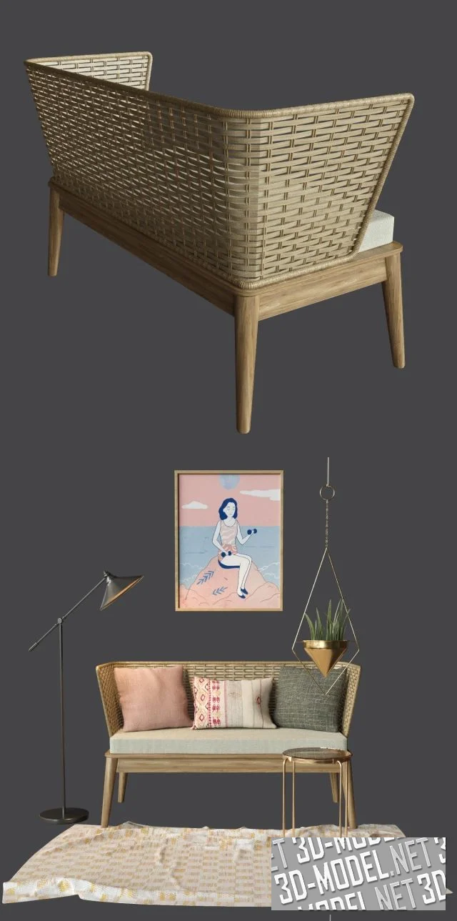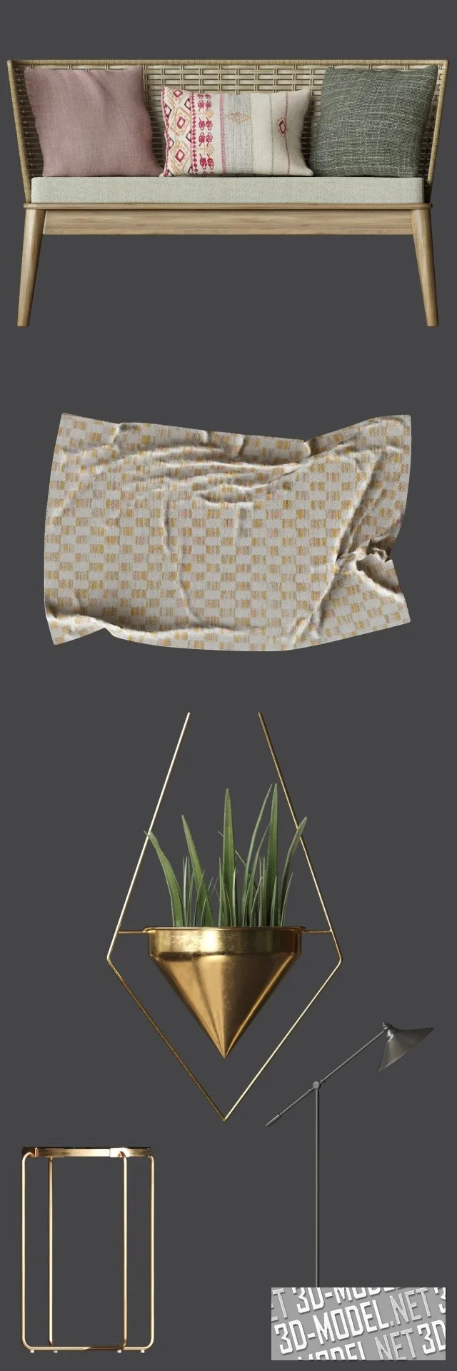 Интерьерный набор с деревянным диваном Jens Woven Windsor, картиной Tallulah Fontaine Beach, ковром Nima Garden Checkered, столиком Gala, напольным светильником Paddy, подушками Agda Printed Yarn и золотистым подвесным кашпо Home Theia Hanging Planter с зеленым растением. Золотистые элементы кашпо и основания круглого металлического приставного столика, деревянная рама сине-розовой картины, плетение ротанга на прямой спинке дивана с серым матрасом, пестрые чехлы подушек, черный светильник и золотисто-белый тонкий коврик создают эклектичную легкую композицию для интерьера в скандинавском стиле.
