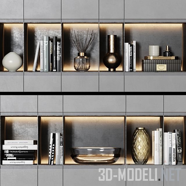 Фасады со встроенной ручкой, горизонтально встроенные полки с декоративным наполнением и матовая отделка поверхности делает этот современный шкаф очень красивым и стильным.