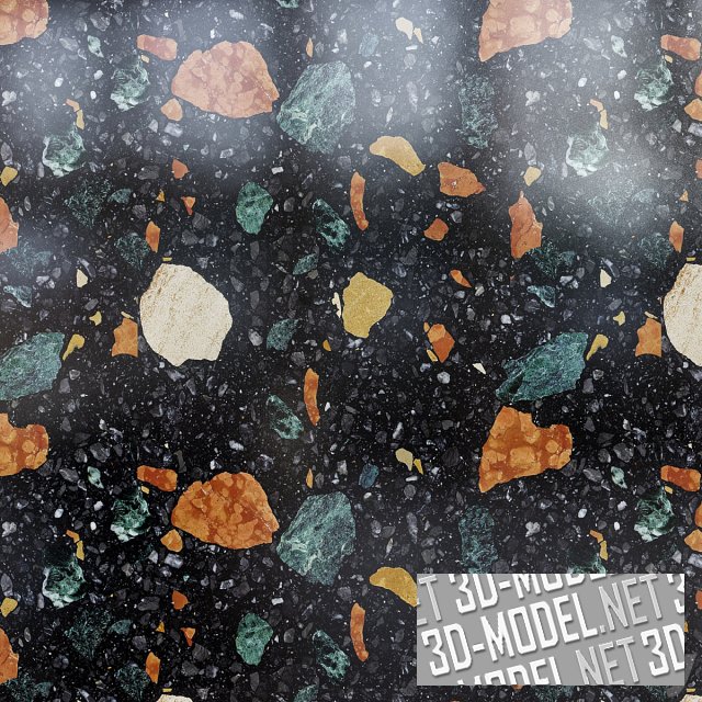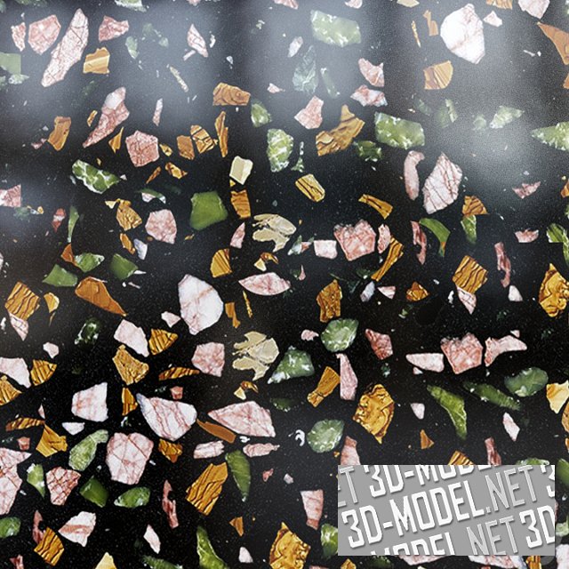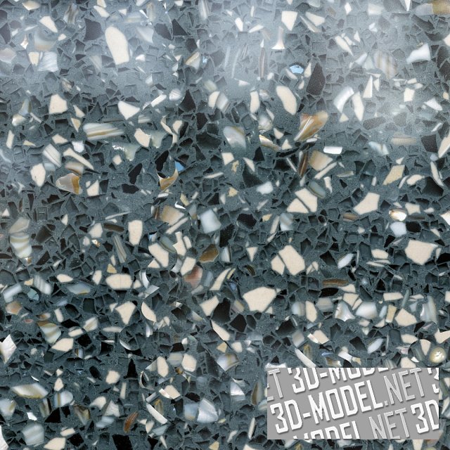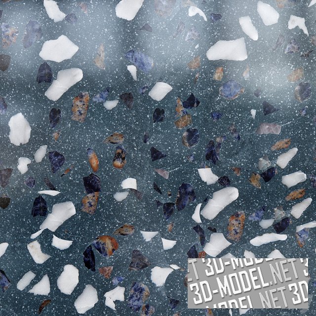 Пять вариантов бесшовных текстур натуральных наливных мраморных полов Terrazzo. Представлены следующие сочетания: белый фон и вкрапления крупных и мелких камней серых, серо-голубых и оливковых оттенков; темно-серый фон в мелкую белую крапинку с крупными вкраплениями из камней белого и черно-фиолетового цветов; густое наполнение из черных и бело-охристых камней по серому фону; мелкие серые и крупные камни яркого янтарного и бледного темно-зеленого цветов по черному фону; яркие травянисто-зеленые, охристые и белые с коричневой прожилкой частички по черному фону.