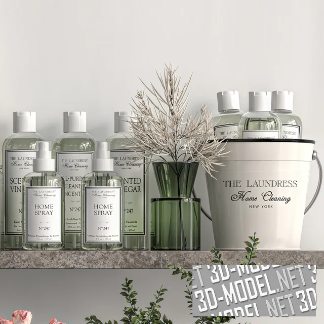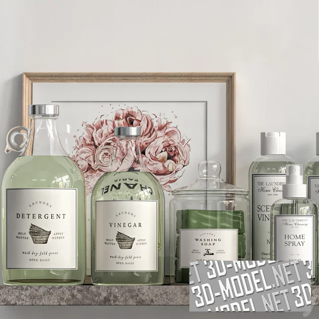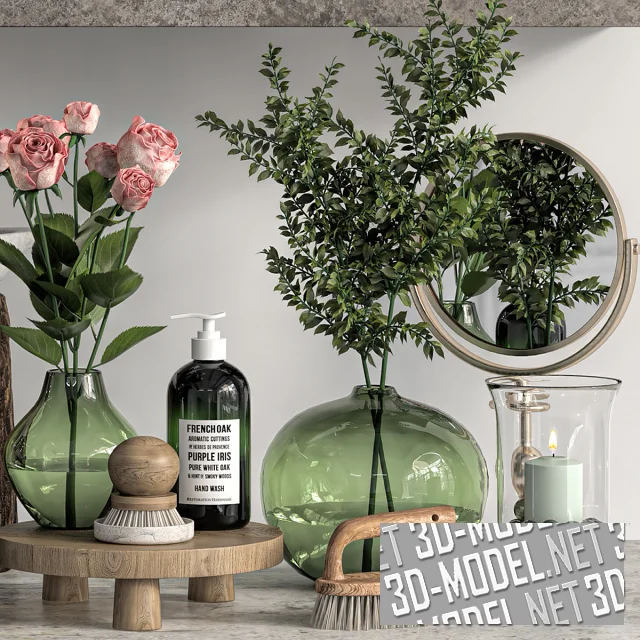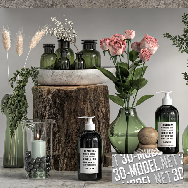 Средства по уходу за телом, аксессуары и декор в стиле Прованс. Пузырьки из прозрачного и зеленого стекла снабжены этикетками в винтажном стиле. Кроме этого в наборе: вазы из зеленого стекла, белое жестяное ведро с черными аккуратными надписями, деревянная фоторамка с акварельным изображением розового букета, зеленые веточки, сухие злаки и розовые розы в вазах, срезанный древесный пень с корой, круглая деревянная подставка с тремя невысокими ножками, щетки для тела, настольное круглое зеркало на подставке, стеклянные подсвечники с зеленоватыми свечами и черными стеклянными шариками.