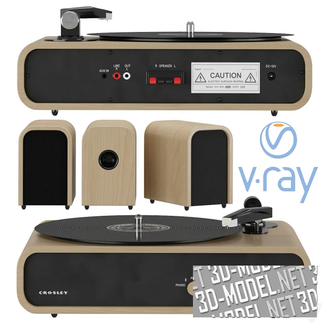 Бытовая система проигрывания виниловых пластинок Crosley GIG Vinyl Player, с встроенным усилителем и вынесенными небольшими акустическими Bluetooth-колонками. Силуэты корпусов из светлого дерева выполнены в винтажном стиле, со скругленными углами.