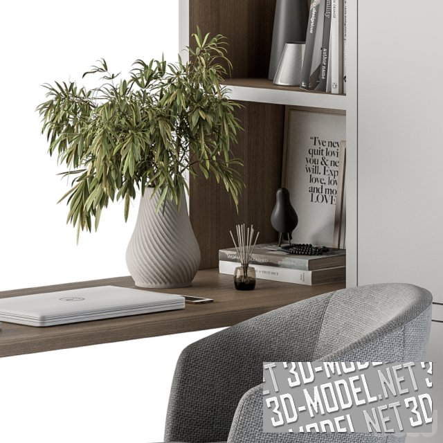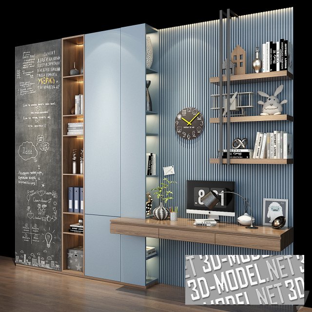 Современная комфортная мебельная группа для обустройства домашнего офиса. Изюминкой мебели является вертикальная черная грифельная доска с рисунками и надписями белым мелом в левой части блока. В наборе узкий вертикальный пенал с открытыми полками и скрытой подсветкой. Эта секция выполнена из плит с текстурой серо-коричневого дерева. На полках книги, художественная керамика и сувениры, папки, коробка.